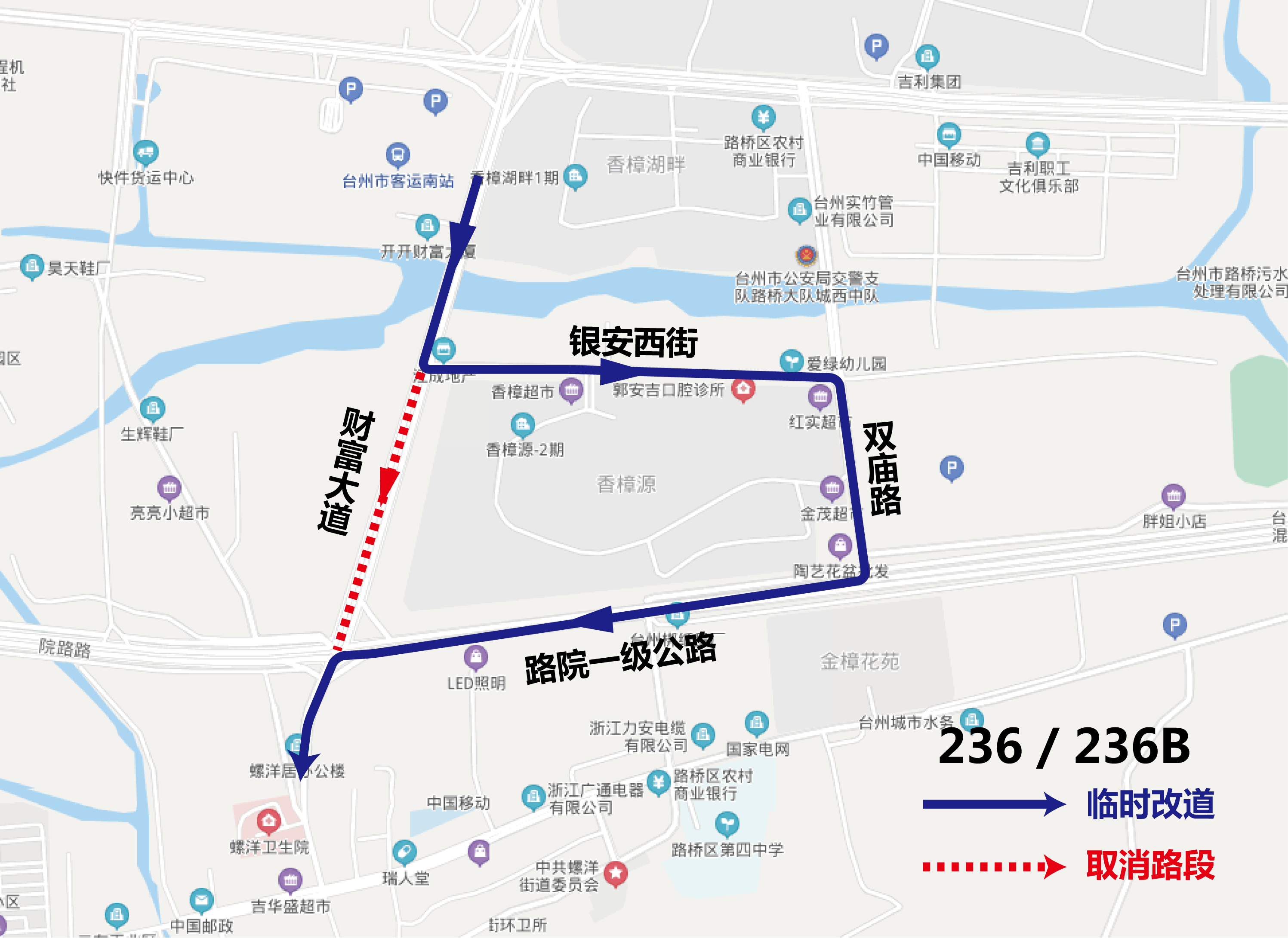 236路(恩澤醫院-院橋車站方向)、236B路(恩澤醫院南-院橋車站方向),調整走向為財富大道-銀安西街-雙廟路-路院一級公路,再回原線路運營。