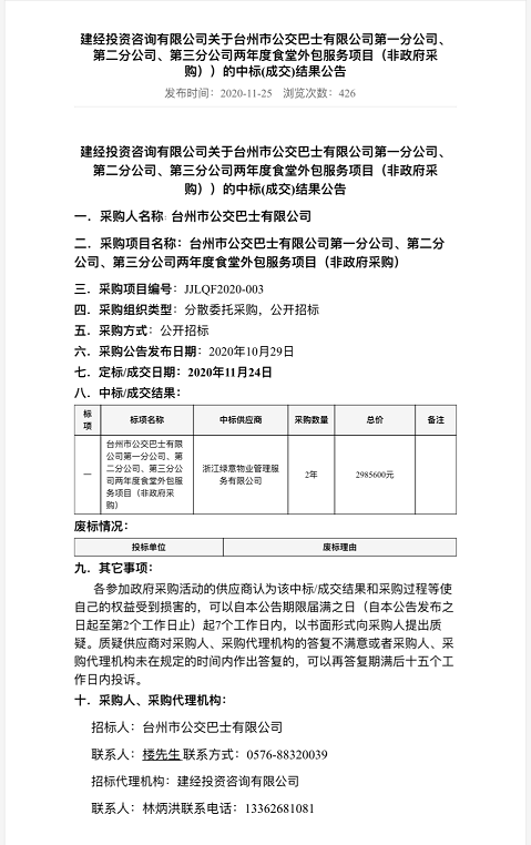 建經投資咨詢有限公司關于臺州市公交巴士有限公司第一分公司、第二分公司、第三分公司兩年度食堂外包服務項目(非政府采購))的中標(成交)結果公告