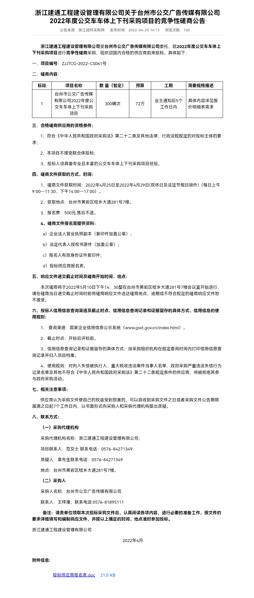 浙江建通工程建設管理有限公司關于臺州市公交廣告傳媒有限公司2022年度公交車車體上下刊采購項目的競爭性磋商公告
