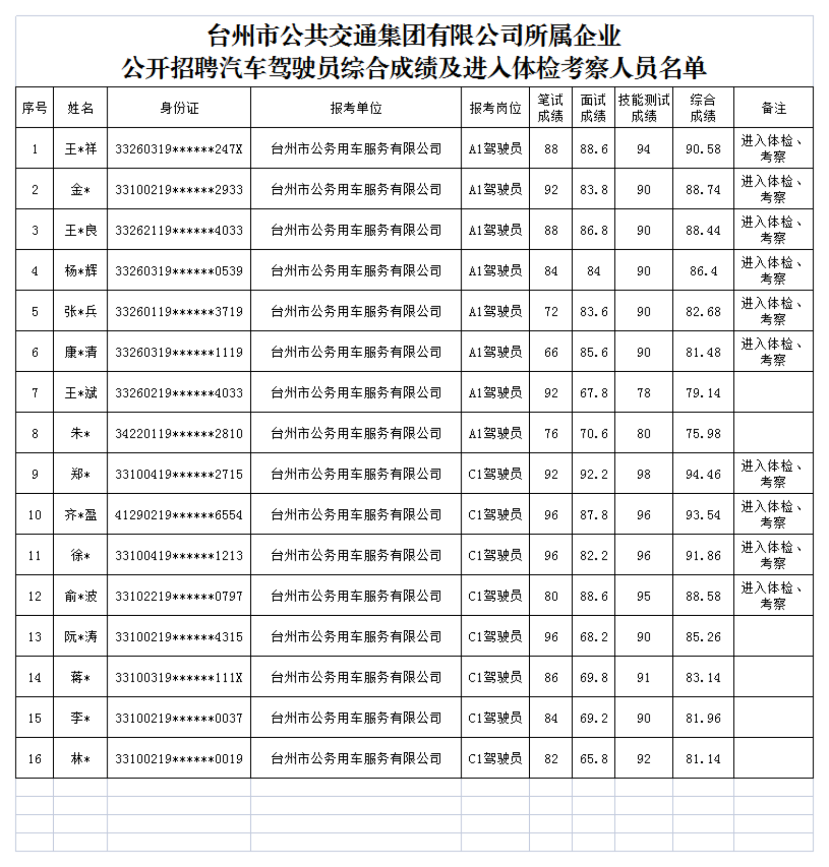 根據臺州市公共交通集團有限公司所屬企業臺州市公務用車服務有限公司公開招聘汽車駕駛員公告相關要求,現將報考人員綜合成績及進入體檢、考察人員名單公告如下: