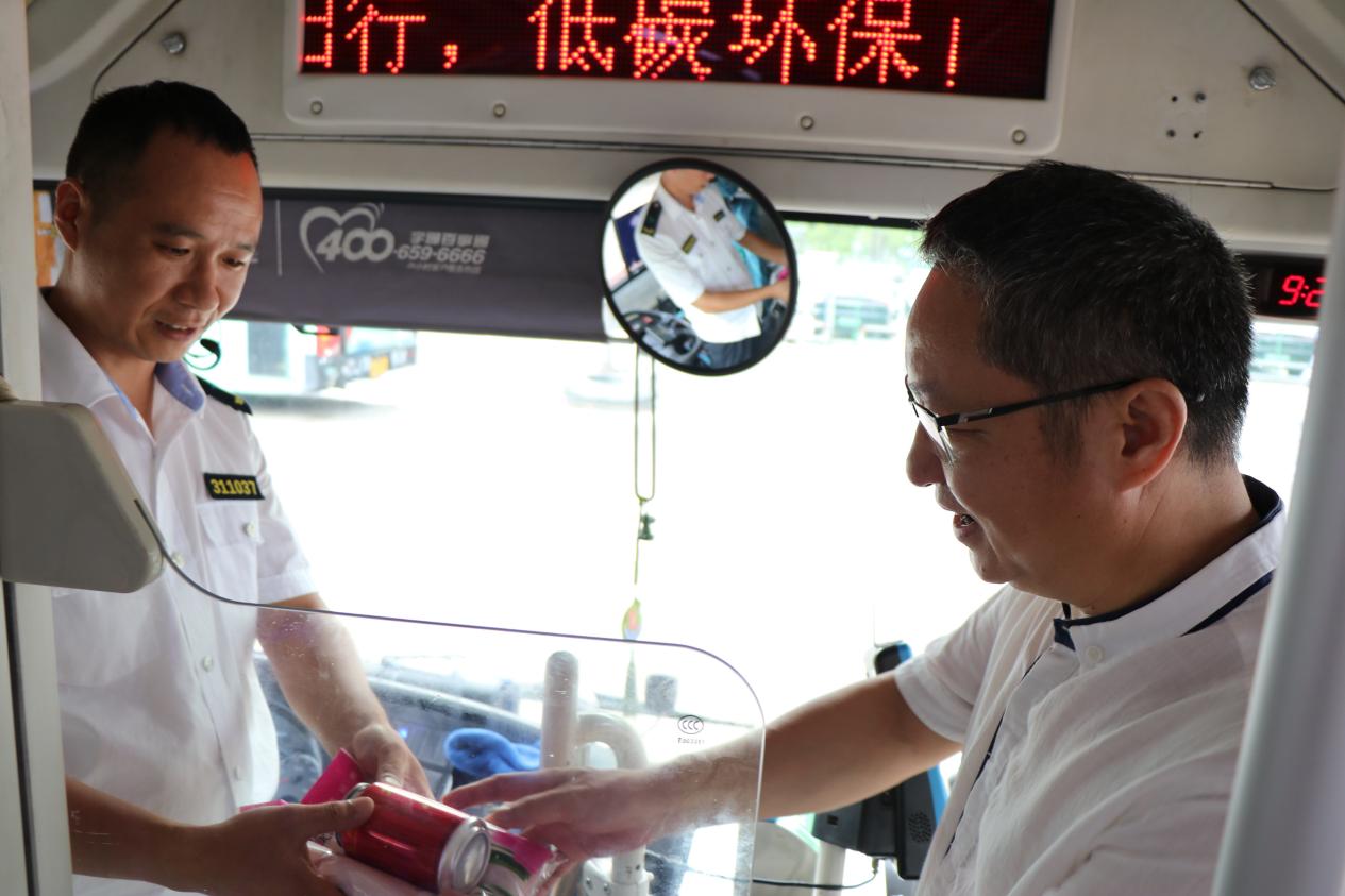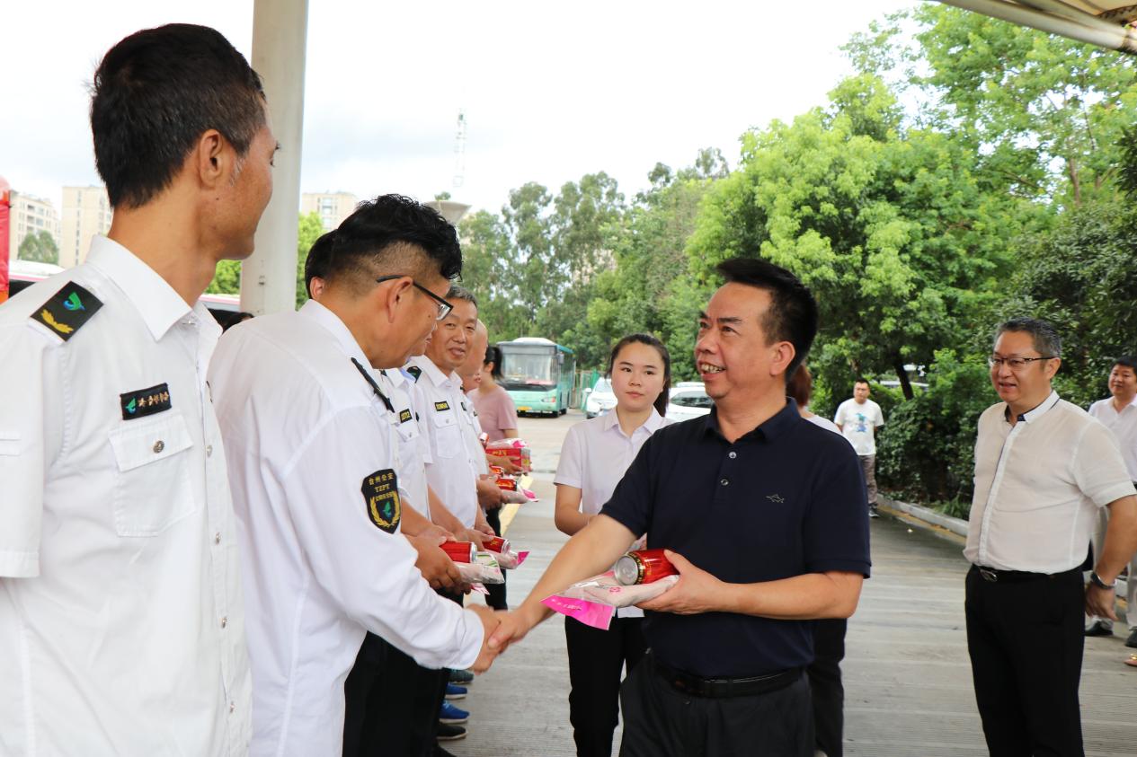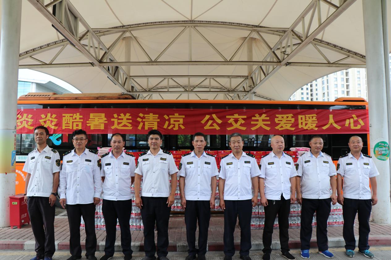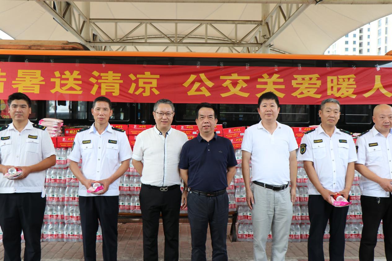 7月26日上午,臺州市交通運輸局副局長童連生、運輸管理處負責人侯靈健、巴士公司總經理韓克華、黨委委員倪建國及相關人員,為公交司機、維修工們開展防暑關懷活動,通過發放加多寶、毛巾等消暑物品,為一線工作者們送去夏日的清涼與關愛。