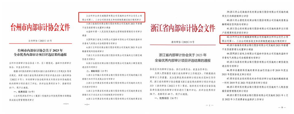 近日,在浙江省、臺州市內審協會舉辦的2023年度優秀內部審計項目評選中,臺州公交集團實施的《臺州市公交巴士有限公司第二、三分公司財務收支和內控制度建設執行情況審計》獲評“省級表彰項目”和“市級優秀項目”,內審成果得到認可和肯定。該審計項目在制度執行、資金管理、權力運行等方面提出審計意見及建議12條,涉及問題金額20余萬元,完善制度、優化業務流程5項,審計整改實效顯著。