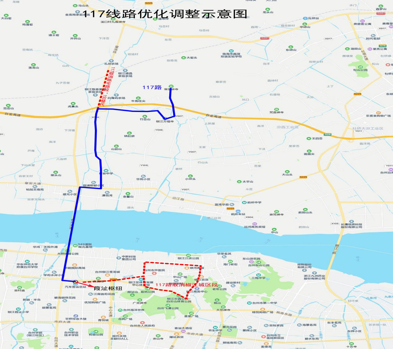 調整后走向:Y007鄉道-Y004鄉道-章梓路-沿江路-臺州大道-黃海公路。