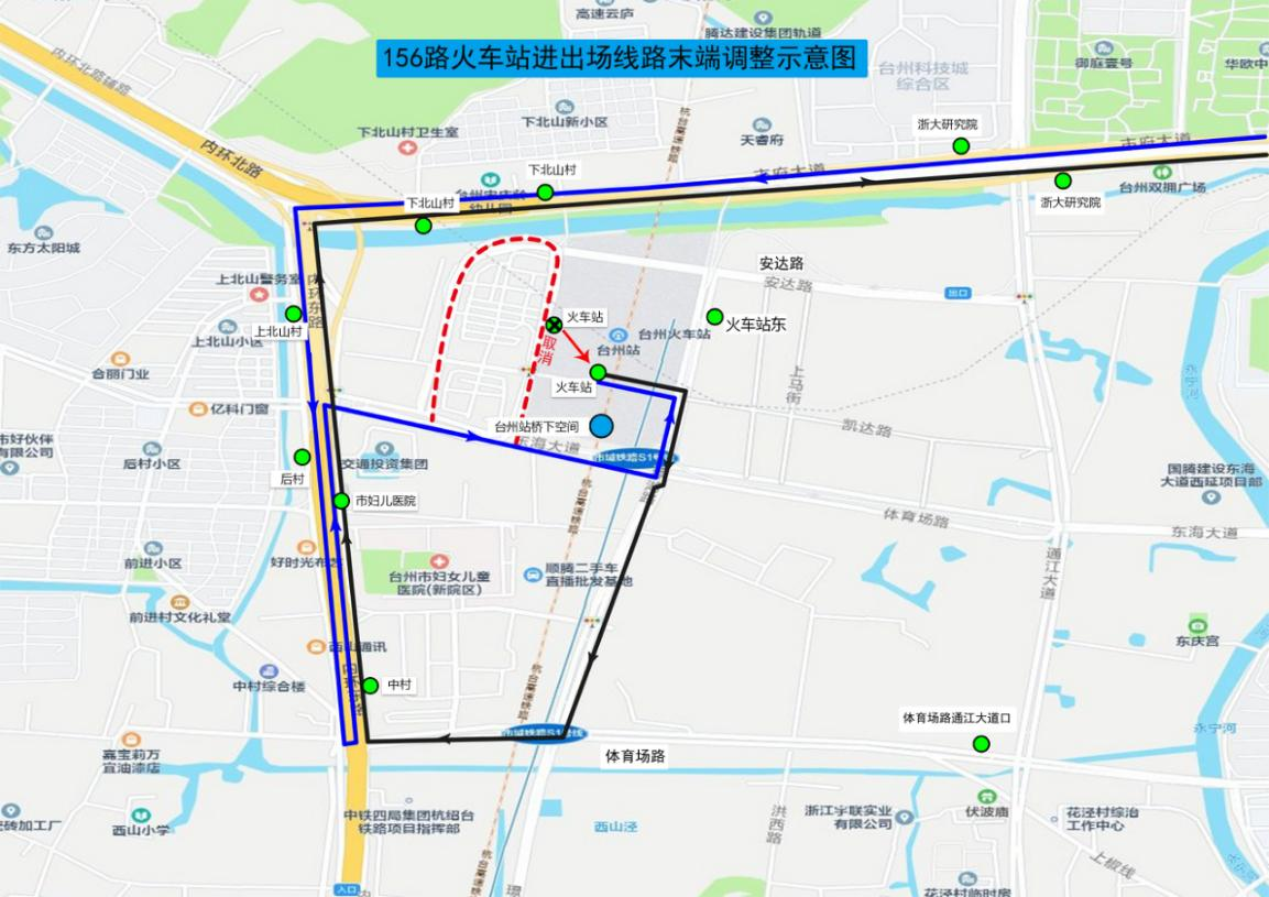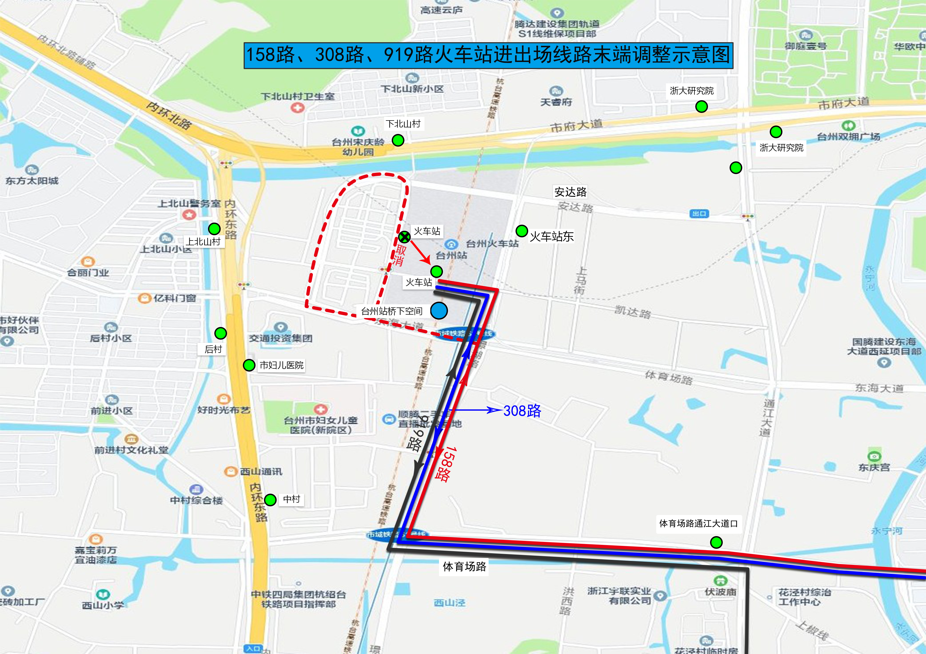調整由體育場路、璟湖路進入臺州火車站公交樞紐站新場站。