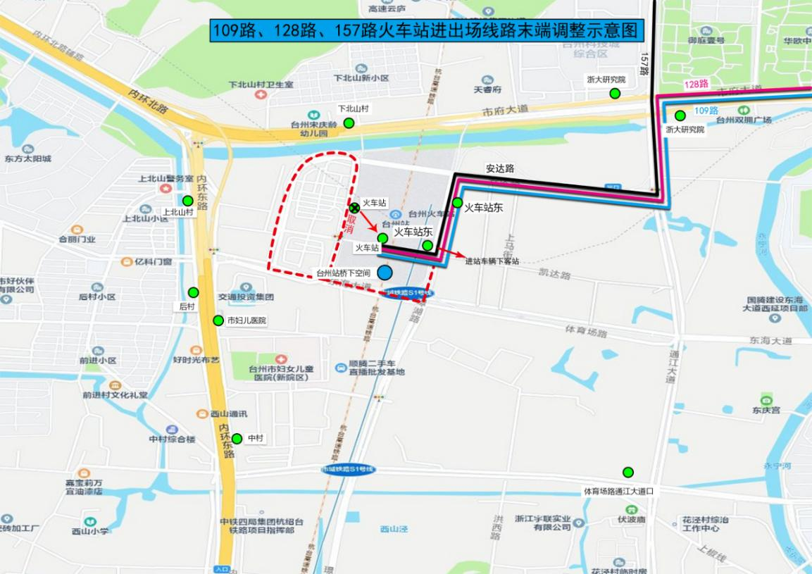 臺州火車站公交首末站(火車站站房西側)將于2025年1月22日搬遷至臺州火車站公交樞紐站(火車站站房南側)。為配合場站搬遷,109路、128路、156路、157路、158路、216路、308路、919路、920路、K8路等10條公交線路首末站將同步調整至新場站,線路末端走向及站點調整如下: