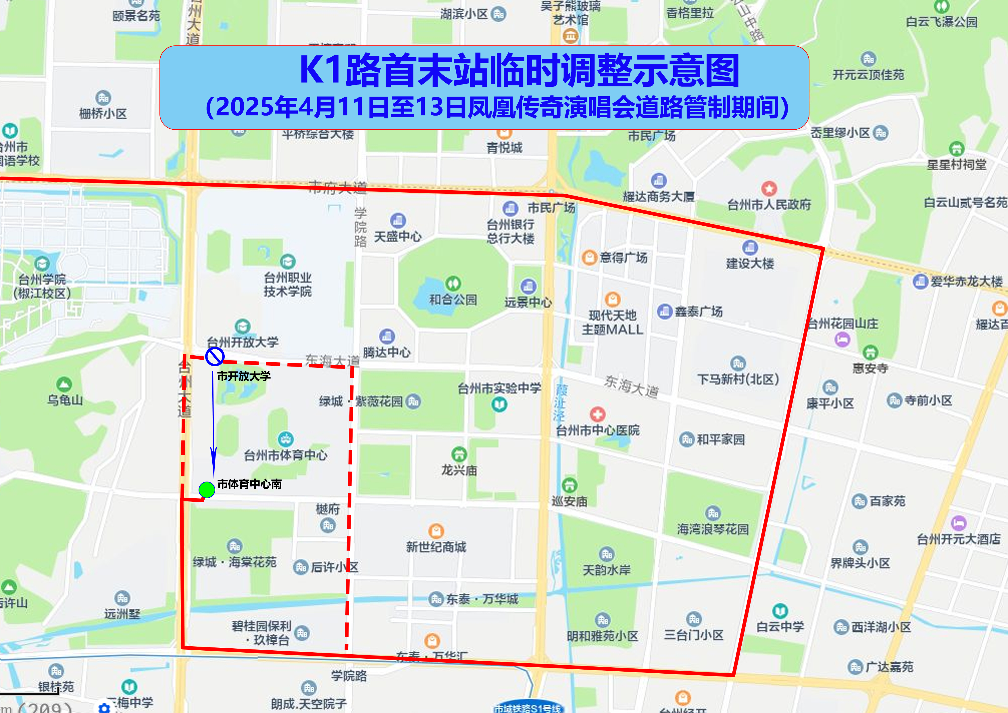 由原開放大學首末站調整至市體育中心南發班。請廣大乘客們至市體育中心南公交場站候車。