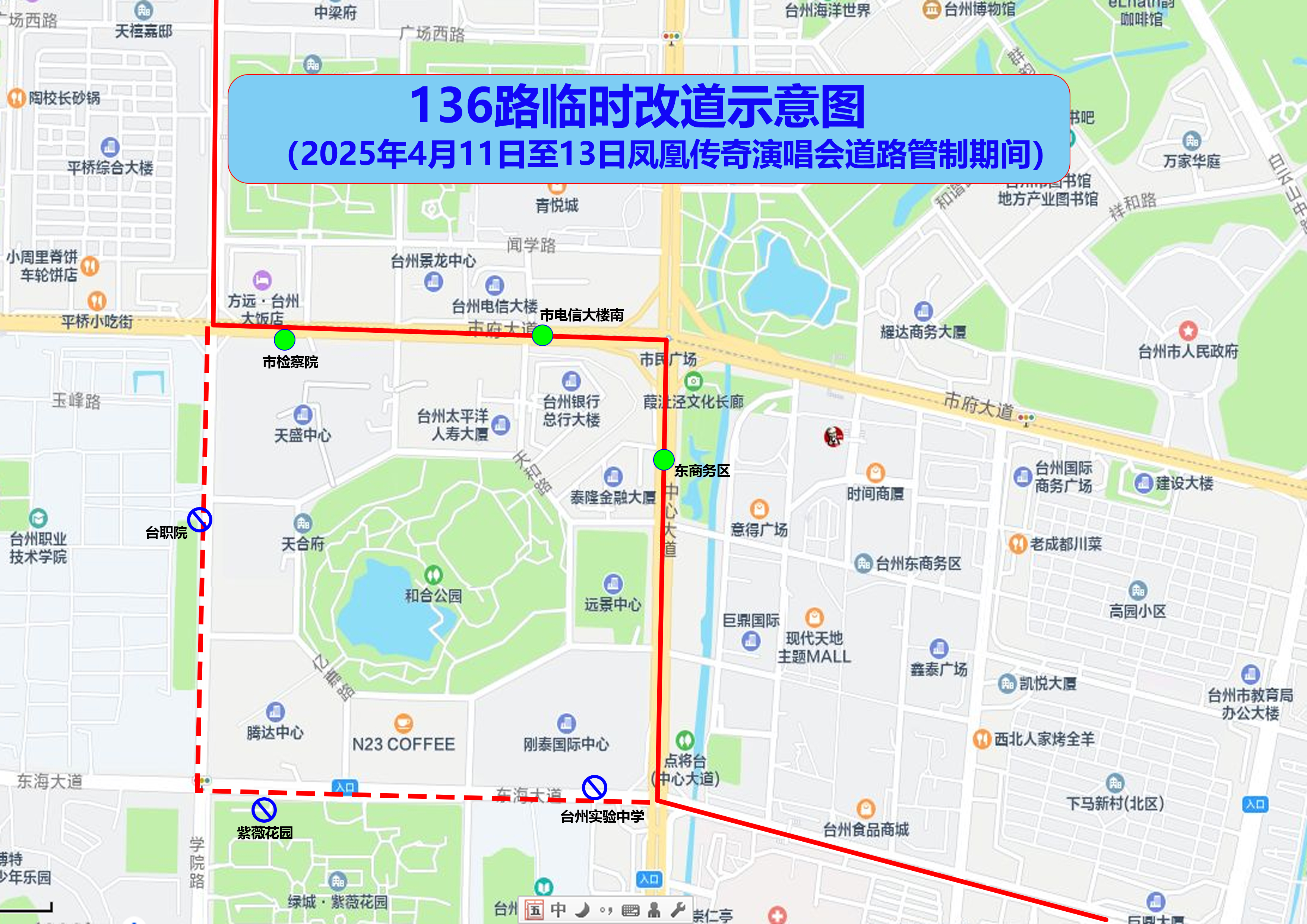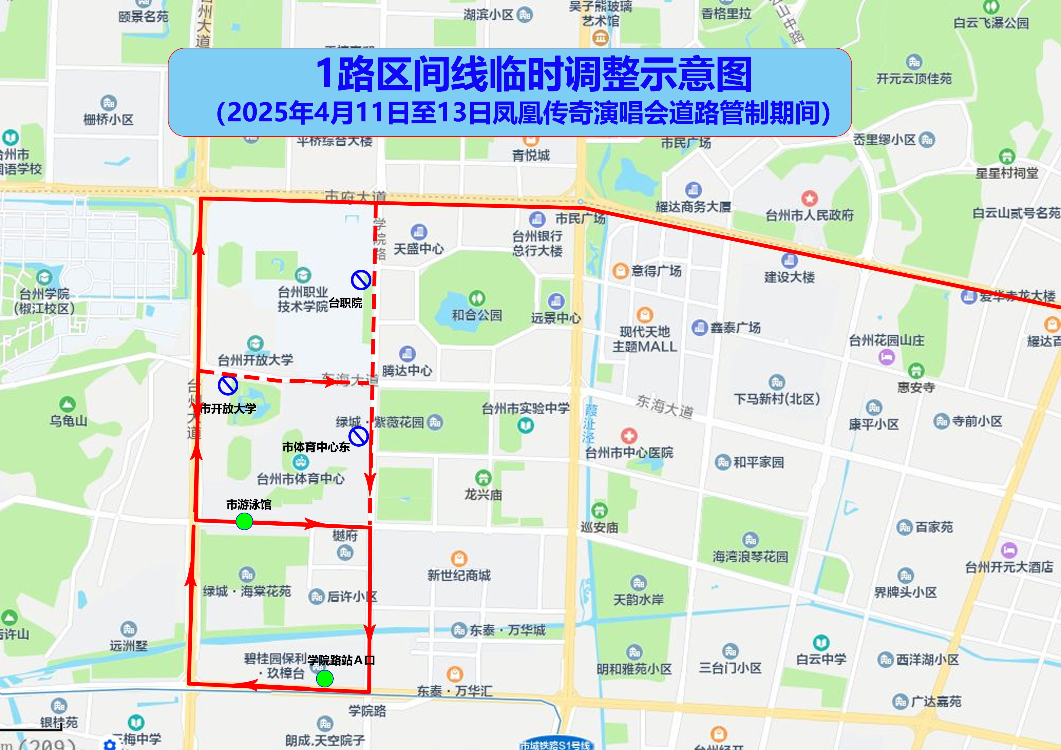 局部調整由臺州大道、體育場路、學院路、開發大道、臺州大道單向循環接原線路。取消臺職院、市體育中心東、市開放大學站點,啟用市游泳館站點。