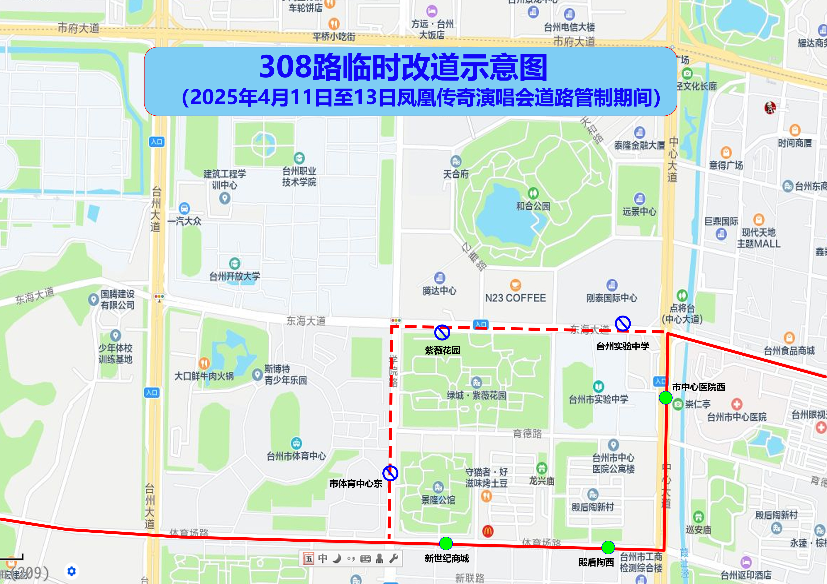 局部調整經中心大道接體育場路原線路。取消市體育中心東、紫薇花園、臺州實驗中學站點,啟用新世紀商城、殿后陶西、市中心醫院西站點。