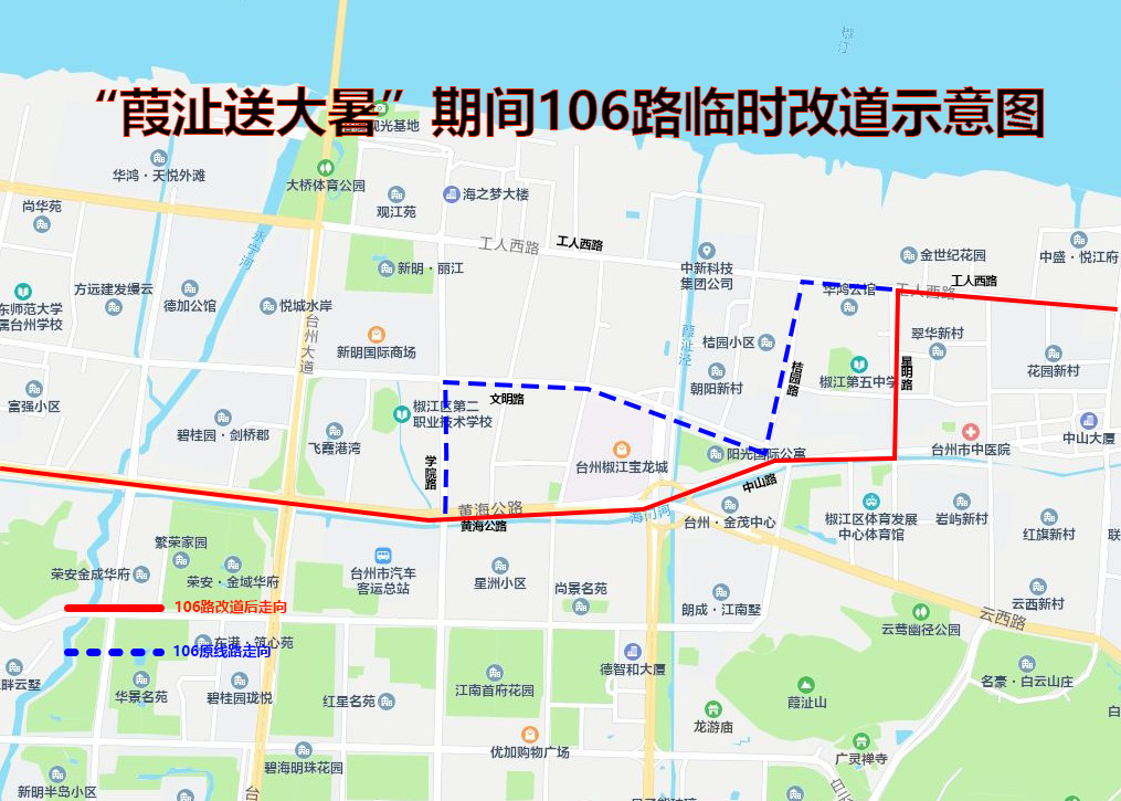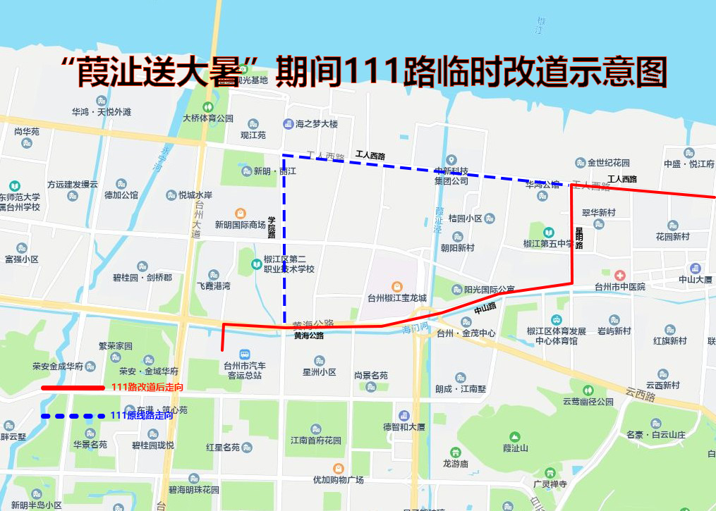 三山始發,調整經黃海公路-葭沚轉盤-中山路接星明路(原線路)。臨時取消椒江第二職校、德鄰北苑、葭沚老街北、桔園菜場、桔園新村、桔園北路口、工人西路星明路口等站點。敬請乘客就近至黃海公路、中山西路、星明路沿線站點乘車。
