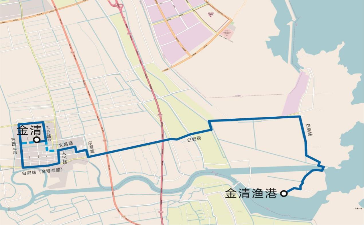 環西一路-金清大道-工業路-中心大道-環西三路-金港西路(白劍線)-人民路-文昌西路-文昌東路-糧庫路-花園新村內部路-東湖路-白劍線-白沙外堤。