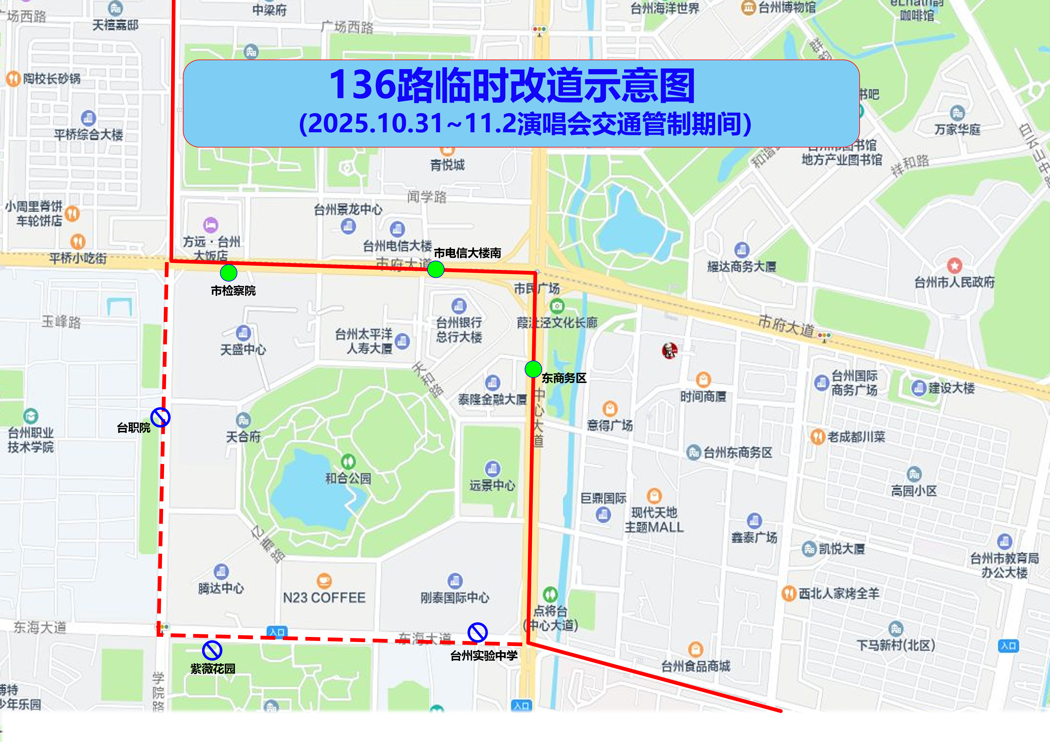 局部調整由臺州大道、體育場路、學院路、開發大道、臺州大道單向循環接原線路。取消臺職院、市體育中心東、市開放大學站點,啟用市游泳館站點。
