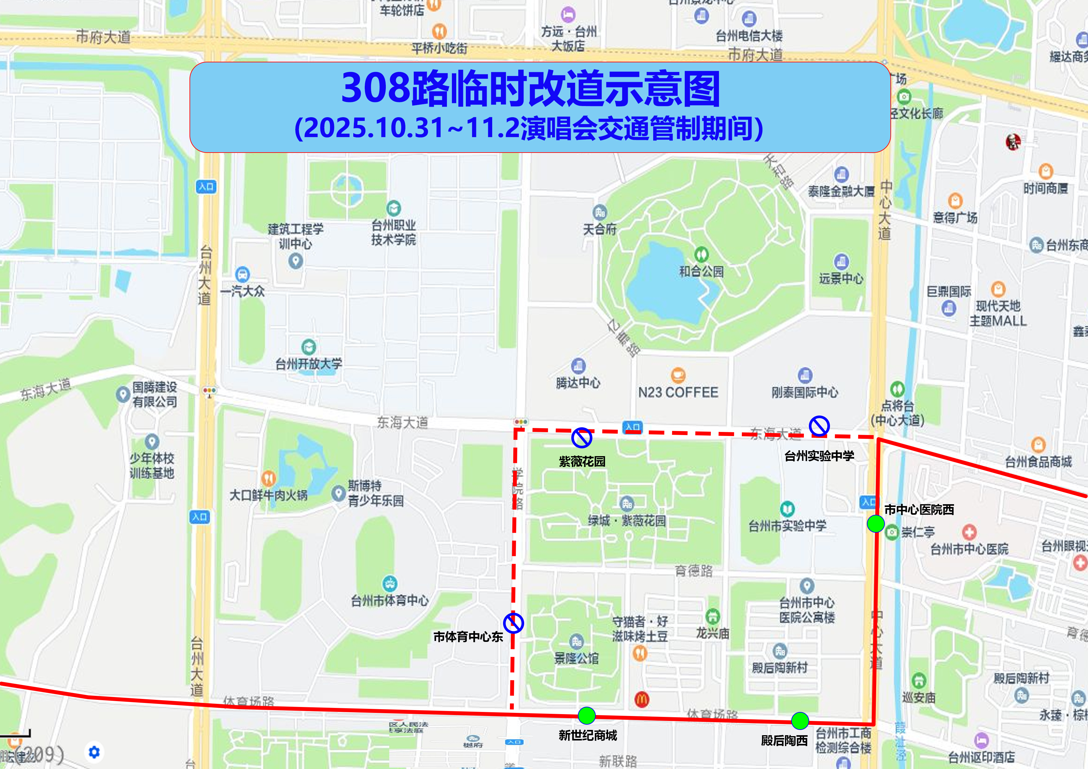 局部調整由體育場路經中心大道接原線路。取消市體育中心東、紫薇花園、臺州實驗中學站點,啟用新世紀商城、殿后陶西、市中心醫院西站點。