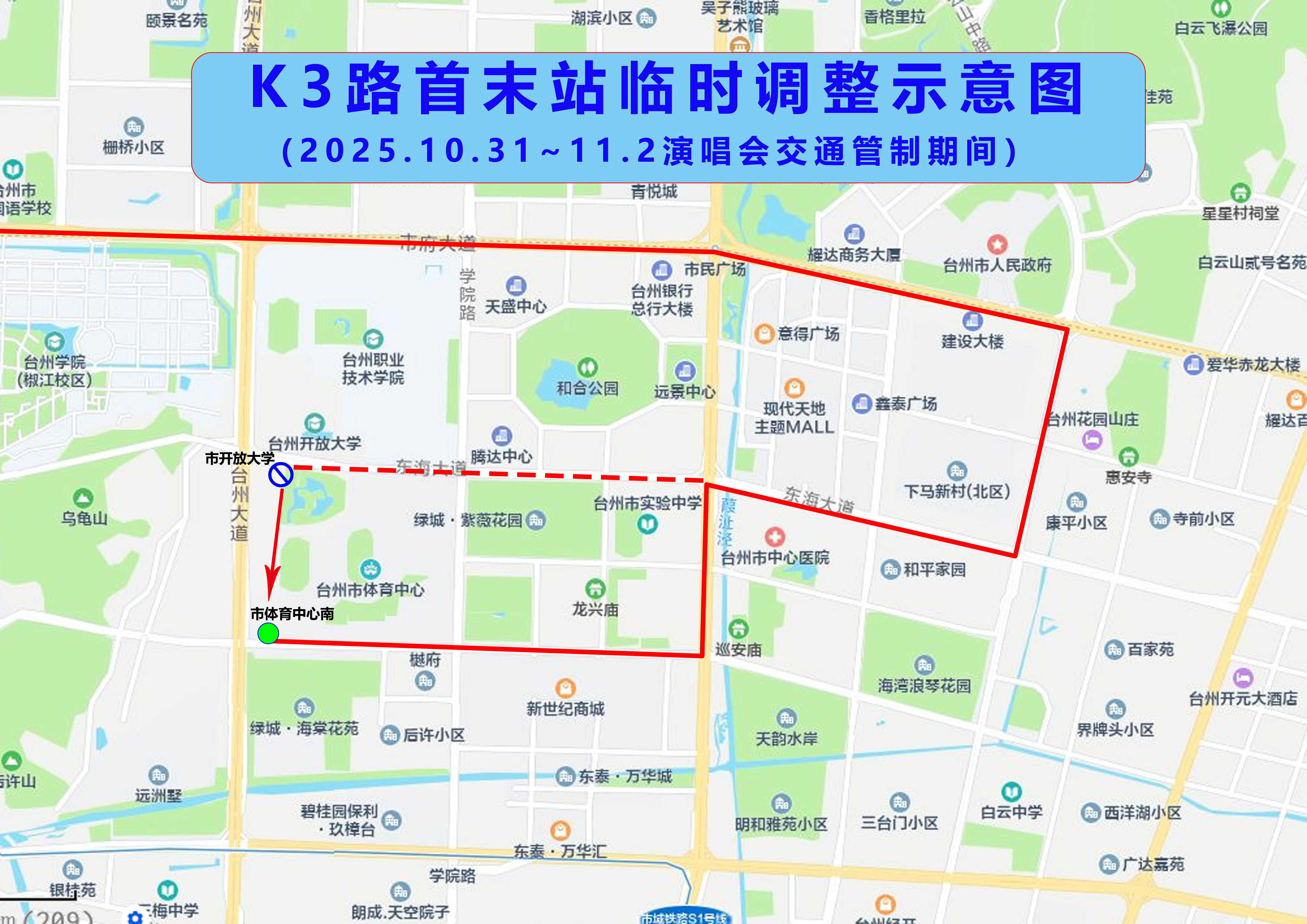 由原開放大學首末站調整至市體育中心南發班。請廣大乘客們至市體育中心南公交場站候車。