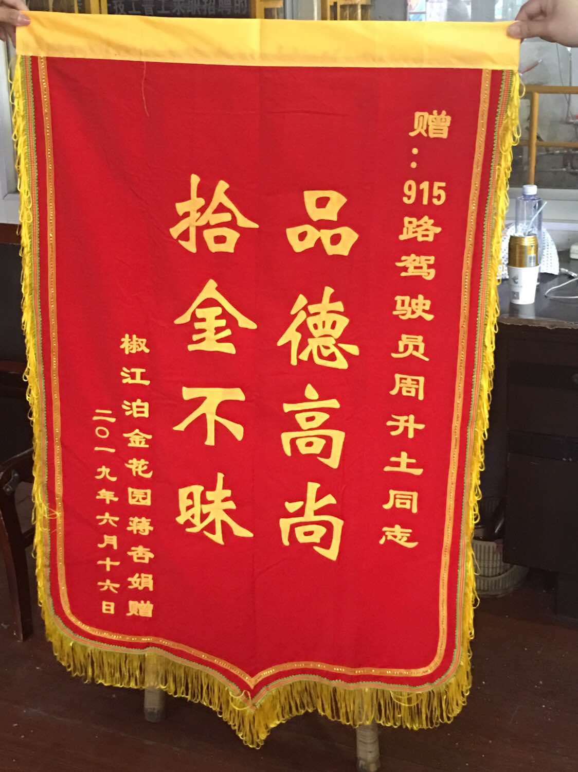 6月17日上午,一面鮮紅的錦旗送到了巴士公司二公司五車隊辦公室,“品德高尚、拾金不昧”八個大字靜靜講述著915路駕駛員周升土師傅拾金不昧的正能量故事。