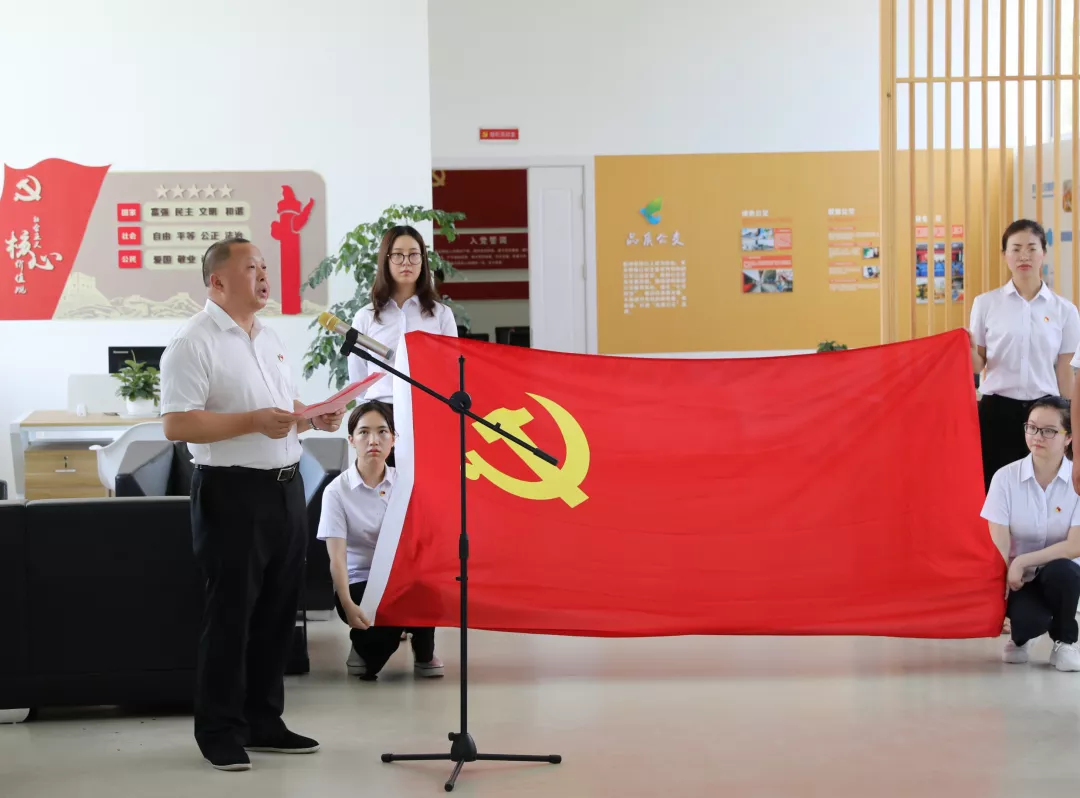 大會在《國際歌》中拉開序幕?!拔抑驹讣尤胫袊伯a黨,擁護黨的綱領,遵守黨的章程……”新黨員在黨委委員徐中美的領誓下,一起緊握右拳,面對黨旗,莊嚴宣誓,誓詞鏗鏘有力,黨員們目光堅毅,鄭重許下對黨的承諾,表達著為共產主義事業奮斗終身的決心。