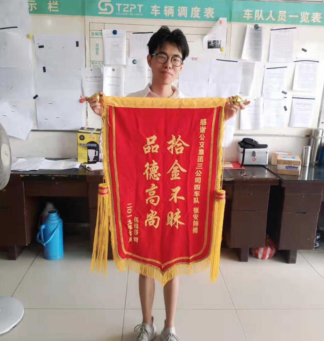 7月31日上午,巴士公司三分公司四車隊調度室進來了一位笑容滿面的年輕人,手上捧著一面“拾金不昧 品德高尚”的錦旗,說是要來感謝駕駛員張安拾金不昧的精神。