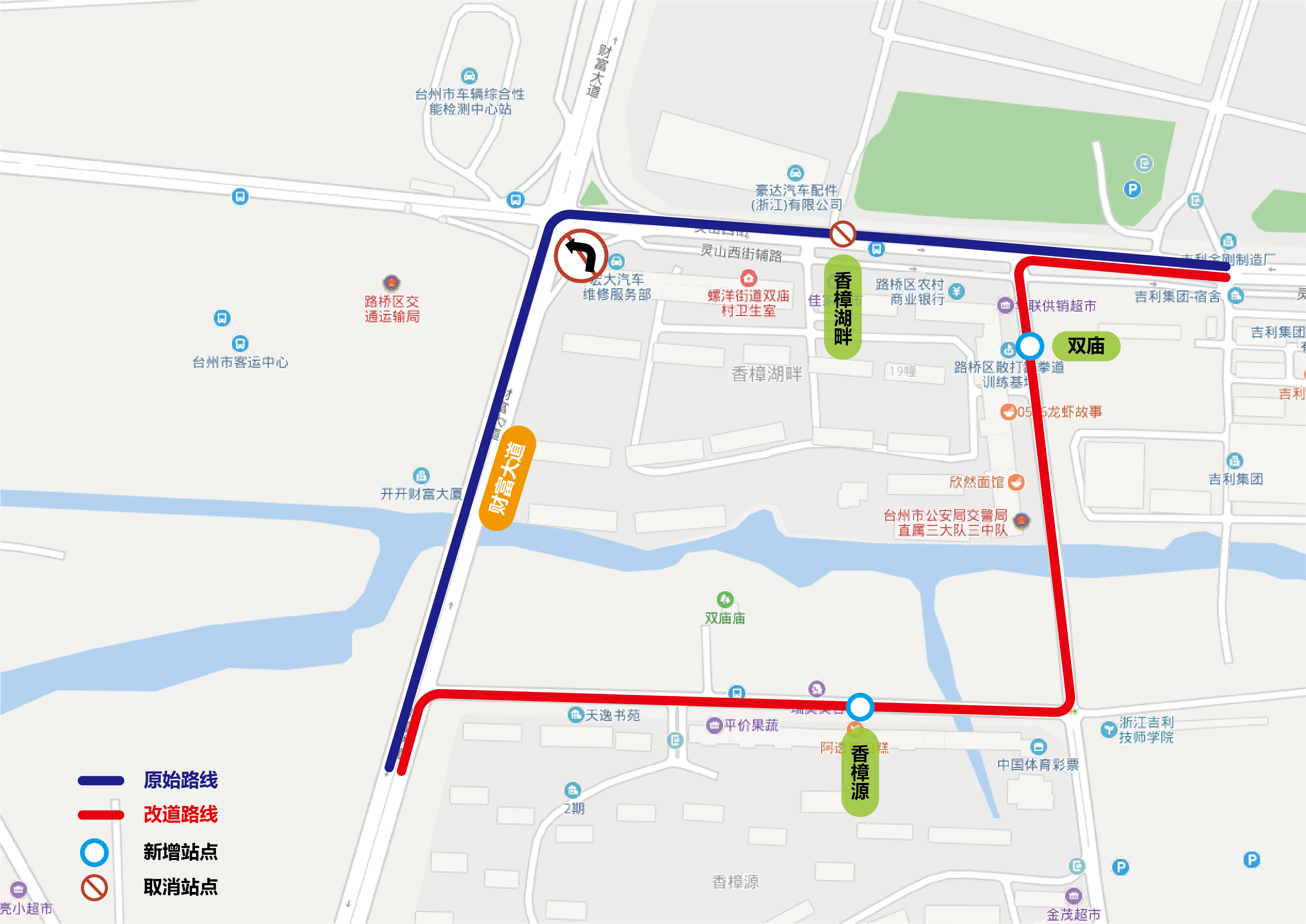 W2路:上行按現線路運行,下行改由靈山西街經財富大道財富商貿城紅綠燈處掉頭至新客運中心,取消雙廟、香樟源兩個站點???,增設香樟湖畔站點???。