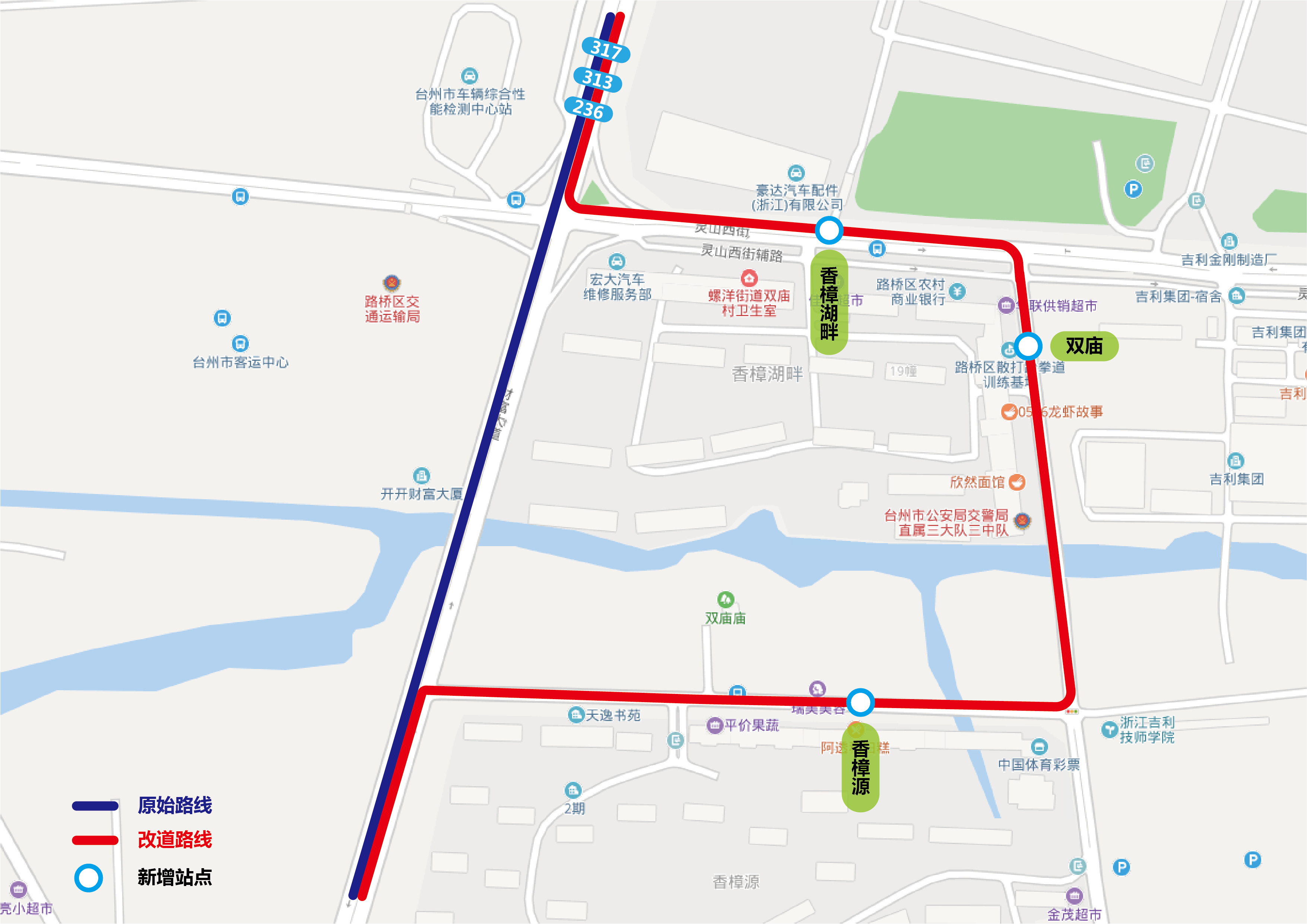 236路、313路、317路:其中236路上行(往恩澤醫院方向)、313路下行(往數碼城方向)與317路上行(往恩澤醫院方向)取消財富大道至靈山西街路段,改由財富大道經雙廟路、靈山西街至財富大道,增設香樟源、雙廟、香樟湖畔三個站點???,236下行(往院橋方向)、313路上行(往螺洋方向)與317路下行(往中岙里村方向)按原線路運行。