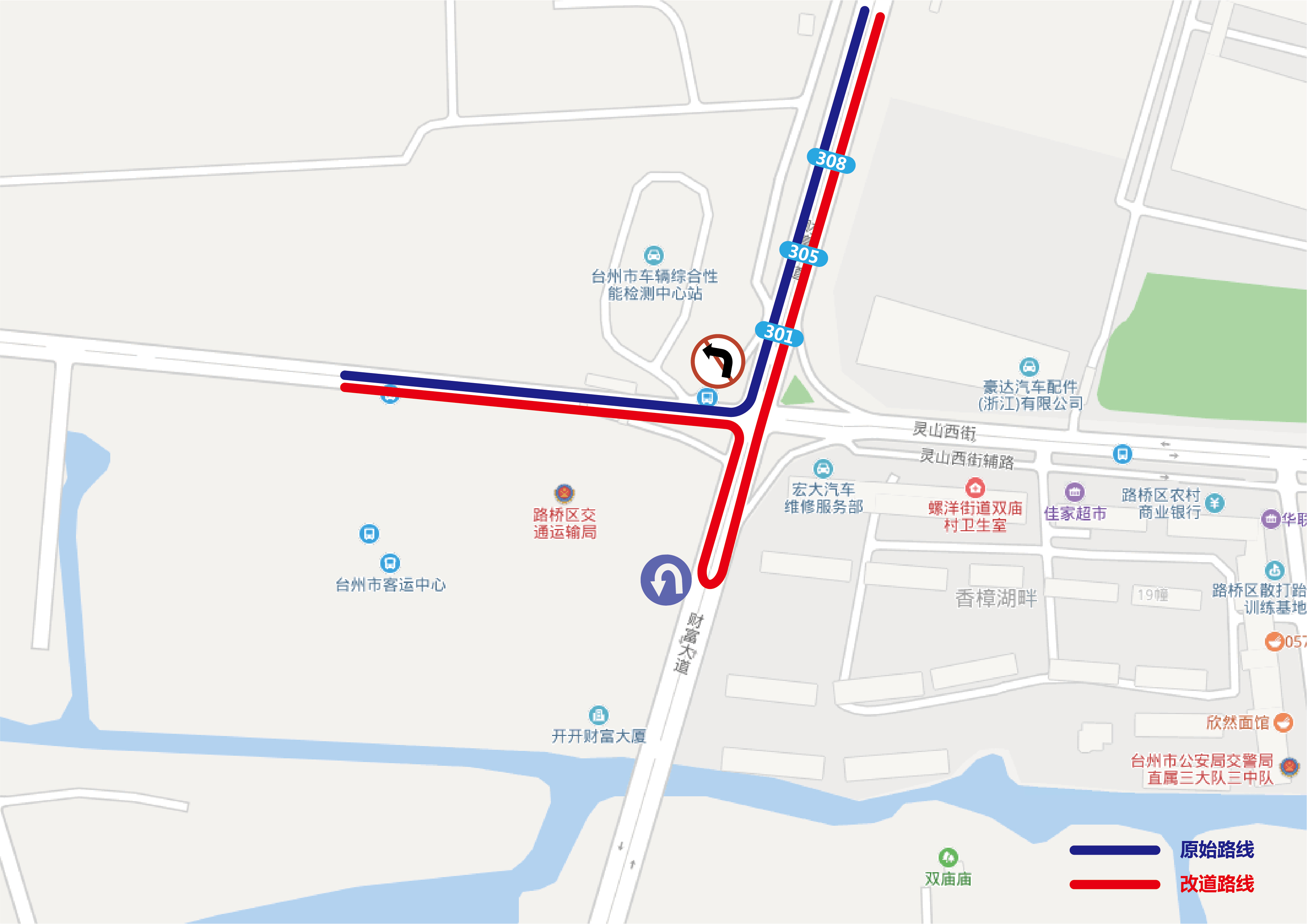 301路、305路、308路:上行保持原線路不變,下行從靈山西街與財富大道交叉口往南100米處掉頭至原線路。