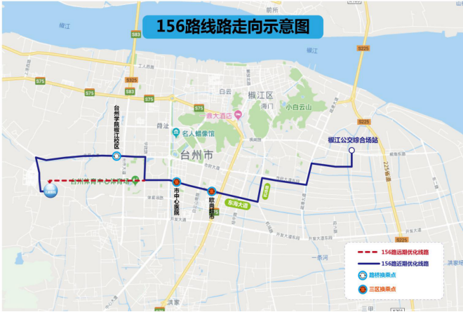 為了進一步方便臺州市高鐵新區(臺州市婦女兒童醫院)與椒江城區之間的公交出行需求,同時提升公交網線覆蓋率。根據目前公交線網布局,對試運營后123B路(椒江江濱路公交首末站至臺州婦女兒童醫院)進行客流需求所向數據分析結合市民信息反饋?,F將123B路公交線進行優化調整,優化調整后取消123B線路名,新增至156路線路名,將于近期開通試運營。